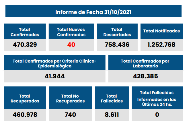 En las últimas 24 horas no se produjeron fallecimientos por covid, por lo cual la cifra total de muertos en el territorio provincial desde el inicio de la pandemia se mantiene en 8.611.