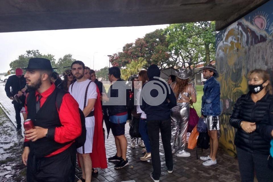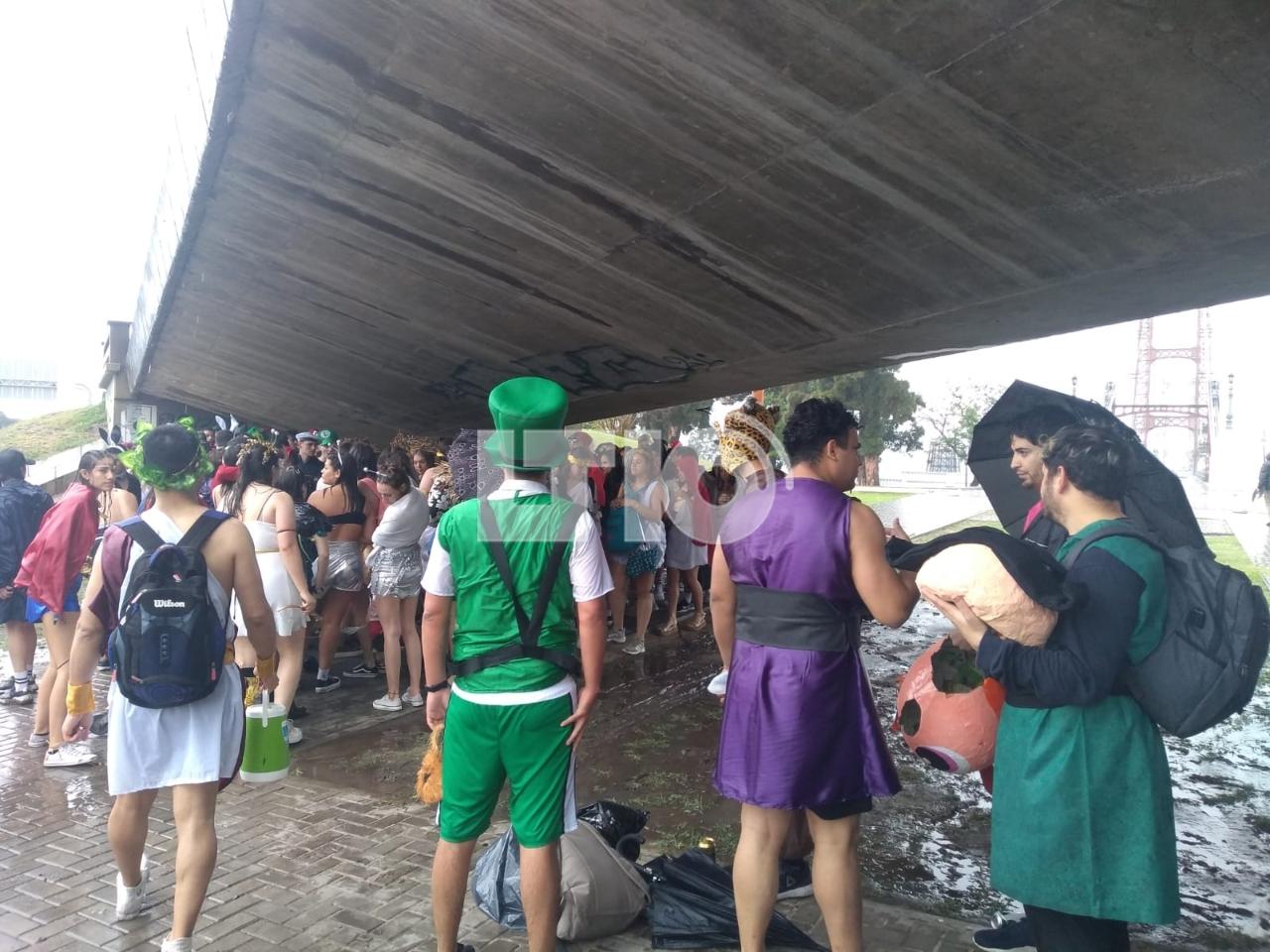 El mal tiempo no los frenó e igualmente se pusieron los disfraces y desfilaron desde Rectorado hasta la costanera. Un poco de color en este día gris.