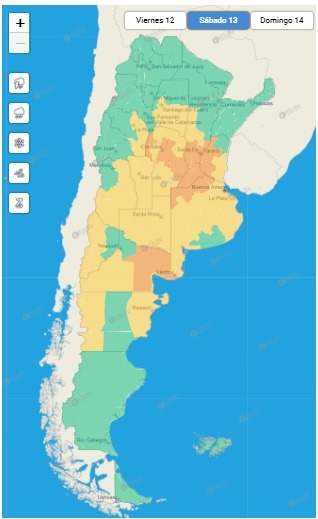 Sábado: min. 18° - máx. 36°. Cielo mayormente despejado, con nubosidad en aumento durante la jornada. Condiciones estables pero desmejorando gradualmente. Alguna posibilidad de lluvias débiles y dispersas hacia la tarde/noche. Temperaturas en suave ascenso de las mínimas y ascenso significativo de las máximas. Vientos moderados a regulares del sector este/noreste, rotando a oeste/suroeste hacia últimas horas del día y incrementando su intensidad.