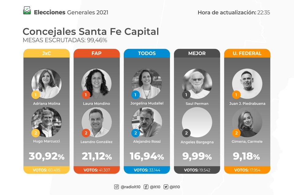 Con el 99,46% de las mesas escrutadas, se acercan los primeros datos de las elecciones generales de Concejales en la ciudad de Santa Fe.