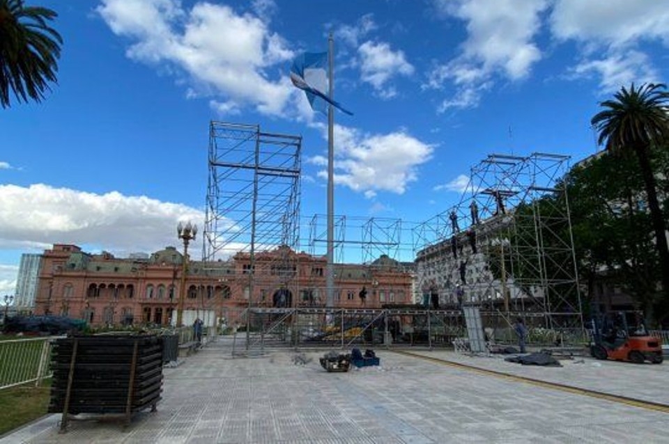 El escenario fue montado frente a la Casa Rosada. Según informaron fuentes oficiales, el jefe de Estado ultimaba este mediodía los detalles de su discurso y se aguarda previamente la difusión de un documento de los partidos y organizaciones que adhieren a la convocatoria.