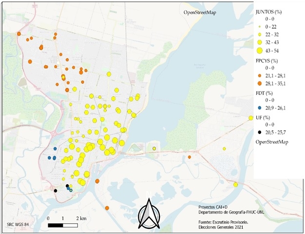 Y continúan: “Al poner el foco de atención en los locales de votación, se observa que en casi las tres cuartas partes de los mismos JxC resulta ser la lista ganadora. Le sigue con un 20% el FPCyS y muy por detrás el FdT y UF con el 4% y 1,5% respectivamente. Además de la contundencia de estas cifras, merece una mención especial que se evidencia una contigüidad espacial de las listas ganadoras según los establecimientos de votación. En este sentido, el FPCyS triunfa en los locales emplazados en el noroeste de la ciudad, Alto Verde y La Guardia, el FdT en la Sub Comisaría Segunda y el UF en Centenario. En casi la totalidad del resto del mapa, los locales le votación otorgan el triunfo a JxC”. (Ver mapa 1)