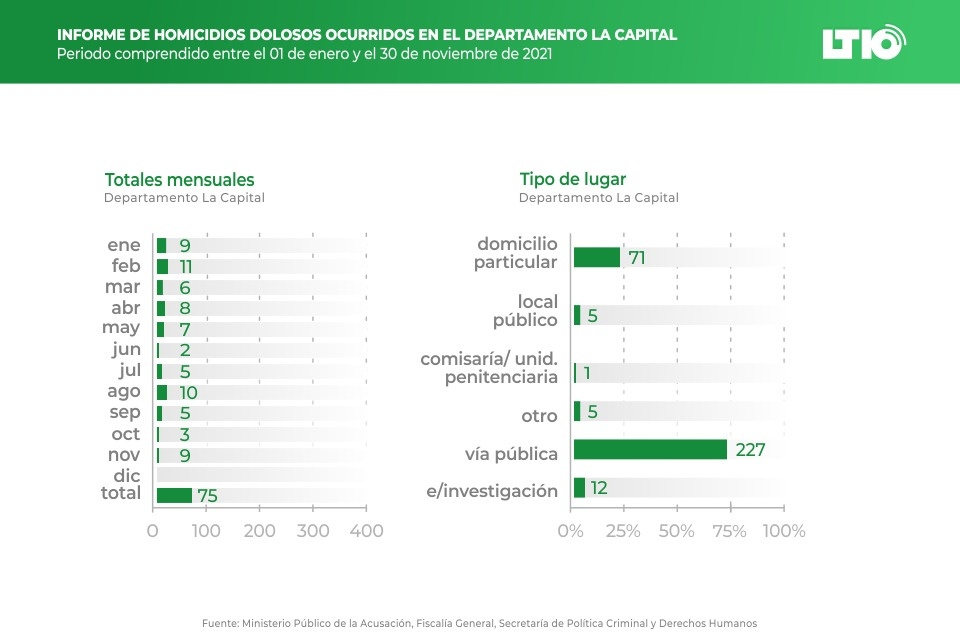 En este cuadro se detalla cuántos homicidios se registraron de enero a noviembre en el Departamento La Capital según las distintas ciudades o pueblos que lo componen.