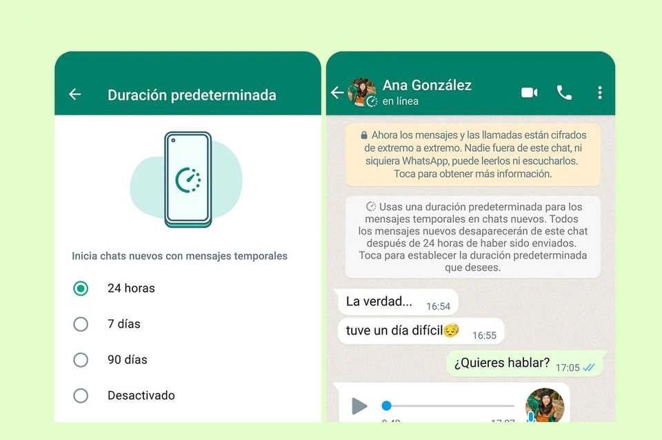 En esta ocasión, la función de mensajes temporales predeterminados de WhatsApp permite que, desde el momento de la activación, las conversaciones puedan desaparecer en el período elegido por el usuario, sean 24 horas, una semana o 90 días.