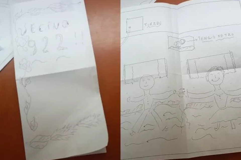 En otra hoja de papel, la mujer dibujo lo que parecería ser la habitación del hospital, con timbre y tensiómetro incluidos, y un retrato de ellos dos tomados de la mano.