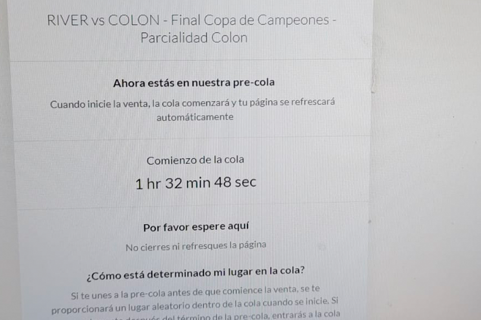 Por el lado de Colón, el club comunicó este lunes por la noche que "la empresa encargada de la venta de entradas ha informado que aproximadamente a las 23:00 hs. se realizará un corte de 1 hora, continuando luego la venta con prioridad para socios con antigüedad hasta las 23.59 hs. del día martes". Si bien se reanudó en el plazo establecido, ahora se dio una nueva interrupción y la empresa trabaja para solucionar el inconveniente.