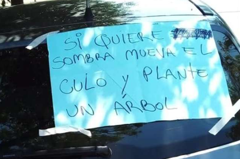 “Si quiere sombra, mueva el culo y plante un árbol”, fue el mensaje que le escribió el vecino con fibrón negro en una hoja de papel que pegó con cinta en el vidrio de la parte trasera del vehículo.