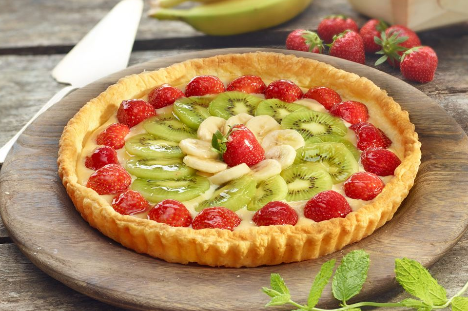 Tropicalísima, la tarta de frutas de estación tiene siete frutas exóticas que estallan de sabor. Con maracuyá, arándanos, frutillas y crema pastelera, que con las frutas siempre combina bien. La crema pastelera tiene la virtud de unir todos los ingredientes pero mantener la individualidad de cada textura y sabor. Más completa que una ensalada de frutas, y tan vistosa como un plato de frutas fileteadas. La receta de tarta de frutas de estación es una opción fácil que queda liviana y fresca, ideal para servir como postre o para la hora del té.