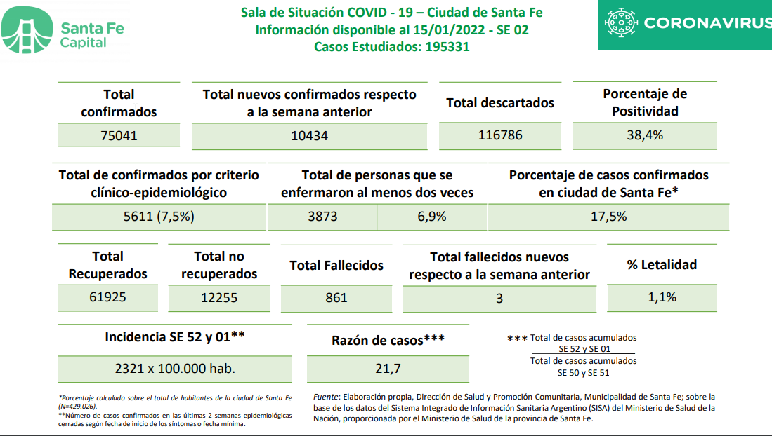 Desde la Municipalidad de Santa Fe presentaron el estado de situación de la ciudad en torno a la tercera ola de coronavirus. En este informe confirman que 3.873 personas que tuvieron coronavirus, se volvieron a contagiar. Además informaron que la semana pasada la ciudad de Santa Fe llegó a un nuevo récord de 10.434 nuevos confirmados respecto de la semana anterior.