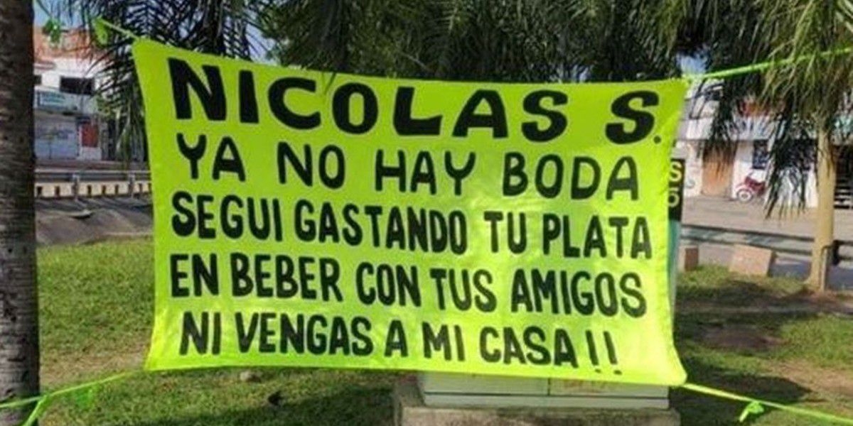 Sin pensarlo, lo colgó en la vía publica y horas más tarde el cartel fue fotografiado. Como era de esperarse, se viralizó en las redes sociales, generando diversos comentarios y opiniones al respecto. “Nicolas S. ya no hay boda, seguí gastando tu plata en beber con tus amigos ni vengas a mi casa”, escribió una mujer en Santa Cruz de la Sierra en Bolivia de una manera clara y contundente.