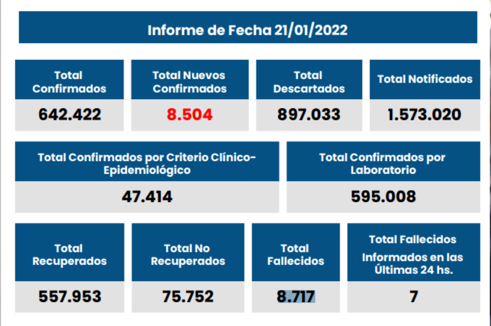 Con estas cifras suman ya 7.694.506 los contagios de Covid-19 notificados en la Argentina desde el inicio de la pandemia, en marzo de 2020, en tanto fallecieron hasta el momento 118.969 con motivo de esta enfermedad.