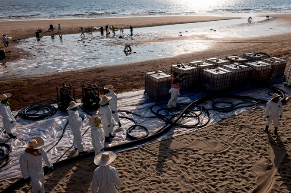 Las autoridades tailandesas llevan a cabo una operación de limpieza para despejar el petróleo derramado de un oleoducto submarino, que está despertando preocupación por el impacto ambiental en las barreras de coral y en las playas turísticas en la provincia de Rayon.