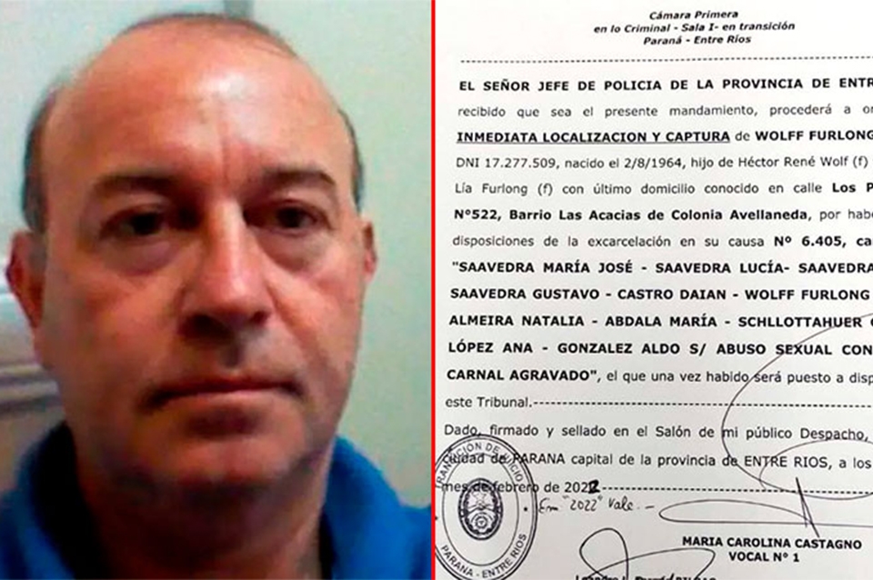 La jueza María Carolina Castagno ordenó a la Policía de Entre Ríos, la inmediata localización y captura del ex comisario y ex empresario de medios Mario René Wolff Furlong, quien está imputado junto a una decena de personas, en una causa por abusos agravado de menores, que integraban el grupo familiar y que se habrían perpetrado en la localidad de Oro Verde.