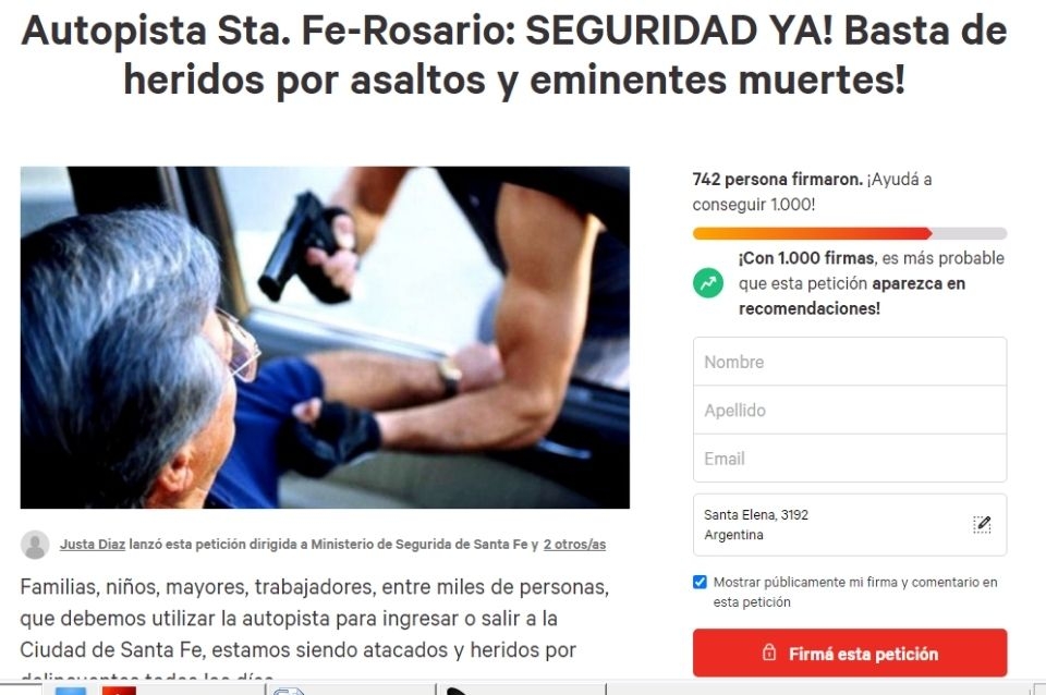 Lo hicieron a través de la plataforma Change.org con el título: "Autopista Sta. Fe-Rosario: SEGURIDAD YA! Basta de heridos por asaltos y eminentes muertes!".