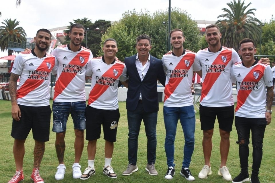 El colombiano Juan Fernando Quintero, Emmanuel Mammana, Leandro Gonzalez Pírez, Esequiel Barco, Elías Gómez y Tomás Pochettino acompañaron a Gallardo junto con el presidente del club, Jorge Brito, y el vicepresidente 1ro., Matías Patanian en el SUM cercano al Monumental, y el secretario técnico, Enzo Francescoli.