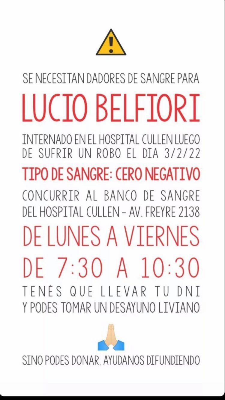 Luego de la internación de Lucio, comenzó a circular en redes sociales una imagen donde amigos y familiares del chico pedian donaciones de sangre. La duda se genero cuando muchos usuarios vieron que el banco de sangre del Cullen abre de lunes a viernes de 8.30 a 12.30 hs.