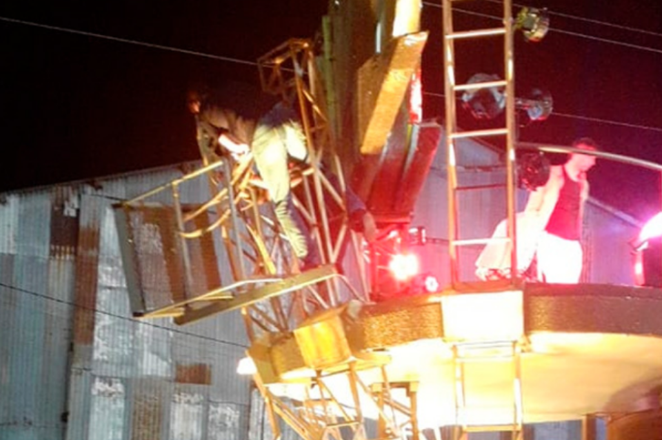 La noche fría del Carnaval de País se preparaba recibir el cierre con la comparsa de Central Entrerriano Marí Marí cuando los operarios que trabajan en las grúas realizaban la operatoria habitual de subir a los integrantes en las diferentes carrozas. Todo estaba preparado para que Marí Marí saliera a la pista, los integrantes formados, todos cantando el tradicional Canta Canta en la previa, pero en el momento que se aprestaban a subir el sol en la parte superior trasera de la carroza de los músicos, cedió la pluma que lleva el canasto, que sirve para subir a los integrantes u operarios, y dos colaboradores, uno de Marí Marí y el otro -un histórico trabajador del carnaval en lo que tiene que ver con el movimiento de carrozas y la suba de integrantes-, quedaron colgados arriba hasta que cayeron al vacío desde unos cuatro metros de altura.