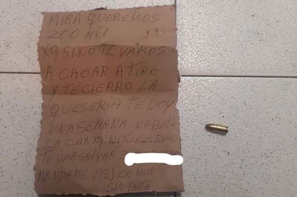 “Queremos 200 mil porque si no te vamos a cagar a tiros y te cierro la quesería. No batas a la cana porque ni tu custodio te va a salvar”, dice el mensaje escrito a mano en un papel, junto con una bala, que recibió el comerciante rosarino, según la foto publicada por el periodista especializado en policiales José Luis Juárez.