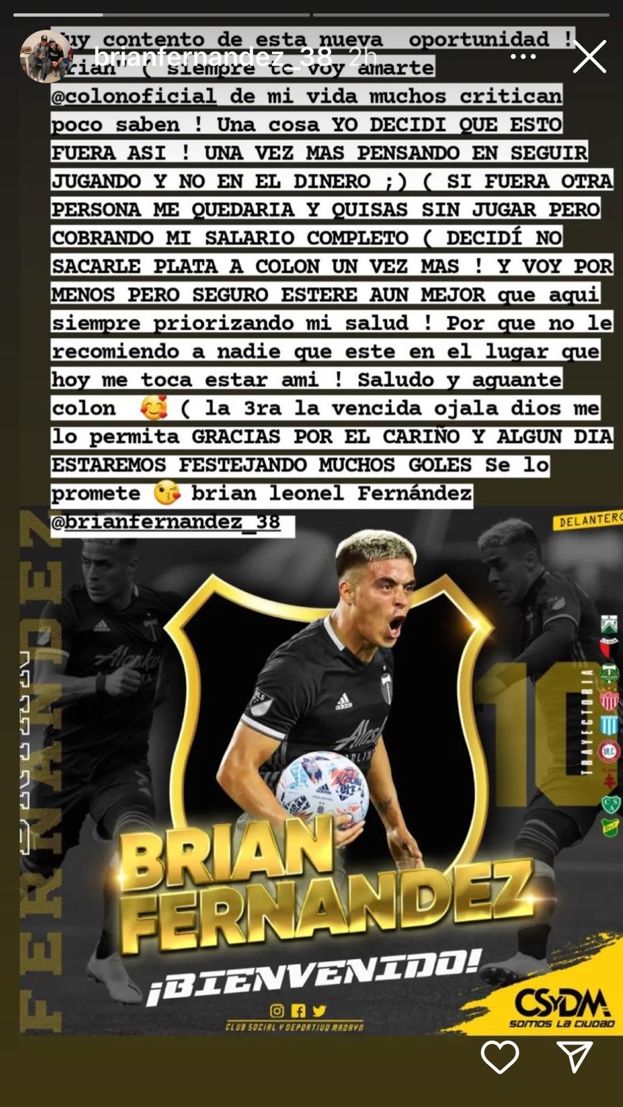 "Muy contento de esta nueva oportunidad (siempre voy a amarte @colonoficial de mi vida muchos critican pocos saben! Una cosa YO DECIDÍ QUE ESTO FUERA ASÍ ! UNA VEZ MÁS PENSANDO EN SEGUIR JUGANDO Y NO EN EL DINERO (SI FUERA OTRA PERSONA ME QUEDARÍA Y QUIZÁS SIN JUGAR PERO COBRANDO MI SALARIO COMPLETO ( DECIDÍ NO SACARLE PLATA A COLÓN UNA VEZ MÁS ! Y VOY POR MENOS PERO SEGURO ESTARÉ AÚN MEJOR que aquí siempre priorizando mi salud ! Por que no le recomiendo a nadie que esté en el lugar que hoy toca estar a mi ! Salud y aguante Colón ( la tercera la vencida ojalá Dios me lo permita GRACIAS POR EL CARIÑO Y ALGÚN DÍA ESTAREMOS FESTEJANDO MUCHOS GOLES Se lo promete Brian Leonel Fernández".