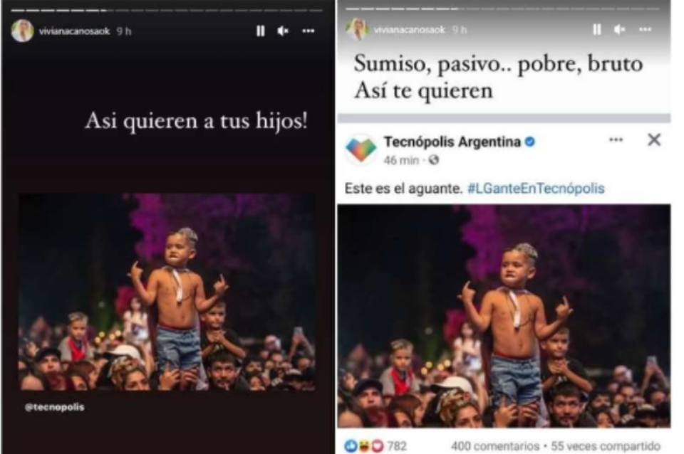 La relación picante entre Viviana Canosa y L-Gante tiene un nuevo capítulo luego de las idas y vueltas en redes sociales tras la publicación de la conductora en el que critica el show gratuito que realizó el cantante el fin de semana pasado en Tecnópolis. “Así quieren a tus hijos”. Luego en otra historia Canosa detalló: “Sumiso, pasivo... pobre, bruto. Así te quieren”, junto a la imagen de un menor alzado y cantando las canciones del artista.