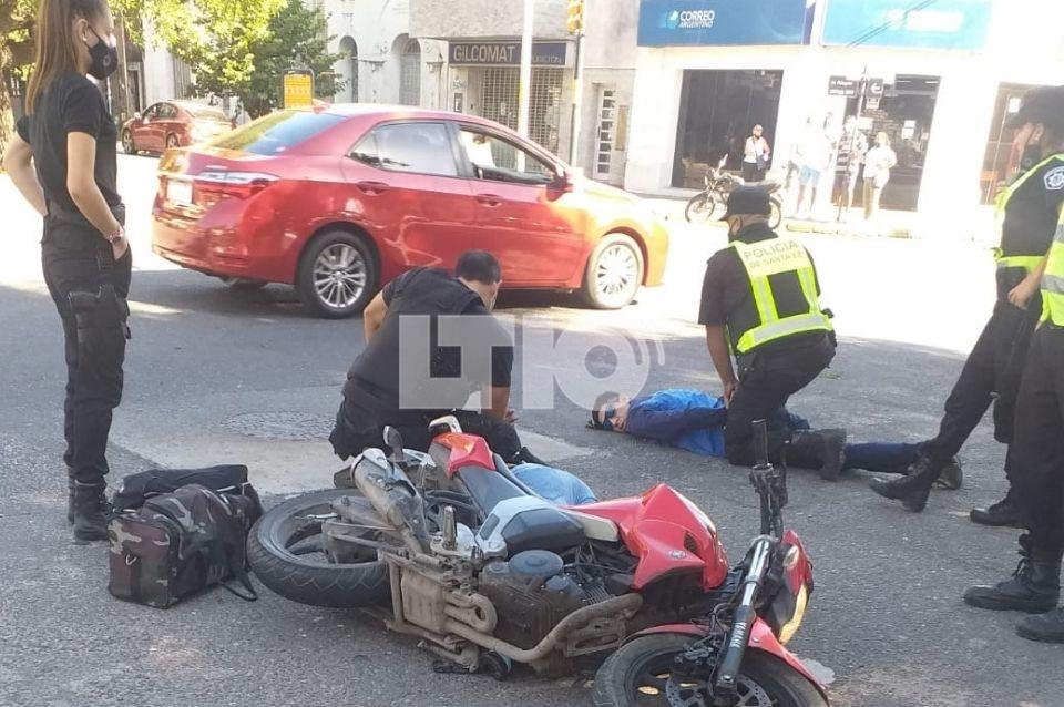 En plena fuga, los ladrones colisionan contra un remise, lo que les hace perder el control de la motocicleta, caen al suelo y son detenidos por policías caminantes que circulaban por la zona.