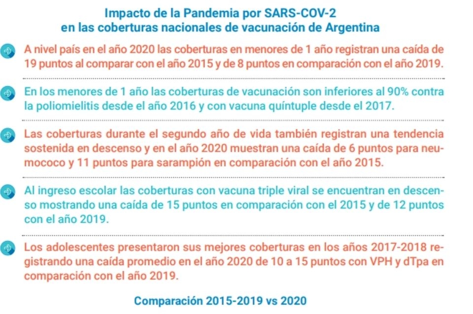 El informe elaborado da cuenta que el impacto de la pandemia por SARS-CoV-2 sobre las coberturas de vacunación fue muy significativo en todos los grupos etarios. En 2020 se registró un descenso promedio de 10 puntos en las coberturas nacionales de vacunación de todas las vacunas respecto al promedio 2015-2019.