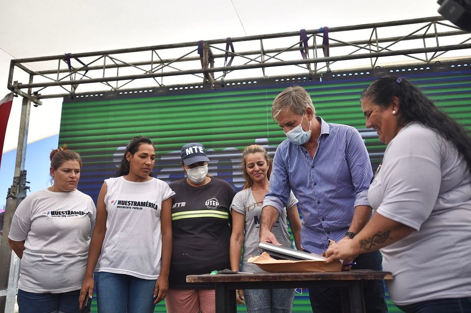 El intendente Emilio Jatón encabezó la licitación, acompañado por integrantes del Movimiento de Trabajadores Excluidos (MTE), Nuestra América, Movimiento Los Sin Techo, Asociación Vecinal República de Los Hornos, Movimiento Solidario, entre otras instituciones, vecinas, vecinos y funcionarios de Nación, provincia, la Municipalidad y el Concejo.