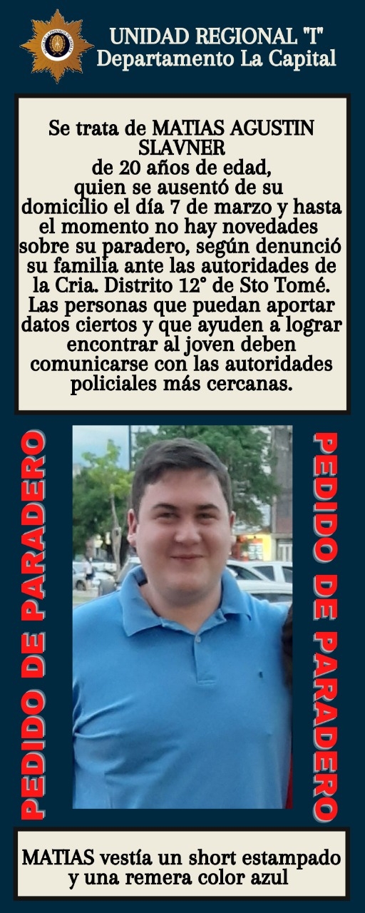 Matías Agustín Slavner salió de su casa en la ciudad de Sano Tomé este lunes y sus familiares perdieron todo contacto con él. Los oficiales de la comisaría 12 de Santo Tomé le tomaron la pertinente denuncia a su familia. que pide, por favor cualquier información útil.
