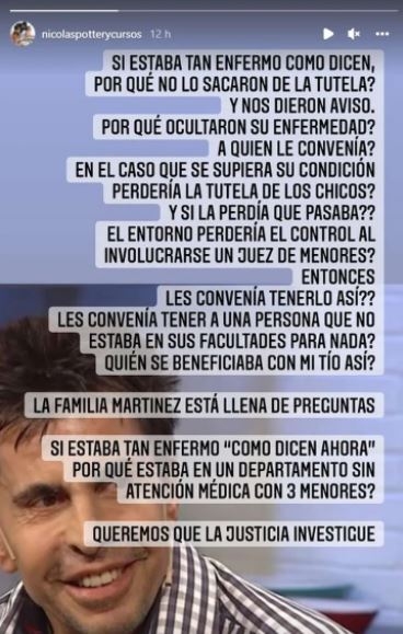 Por su parte, Nicolás realizó un posteo en Instagram en el que sembró dudas sobre las verdaderas y ocultas intenciones de la familia Fort respecto a Martínez. Da a entender que a ellos les convenía tener de tutor legal a una persona que no tuviera todas sus facultades físicas y mentales para criar a los menores.