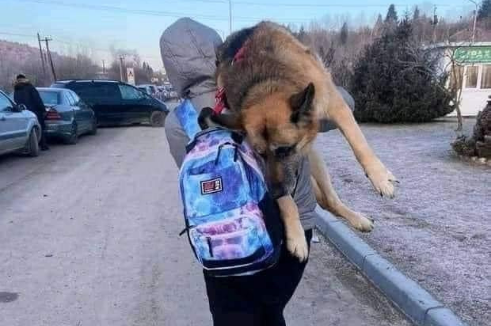 Que fotón, por favor. Una chica cargó más de 17 kilómetros a su perro (los ovejeros muy adultos tienen displasia de cadera) hasta la frontera de Ucrania con Polonia. pic.twitter.com/VUwTgU7Q45