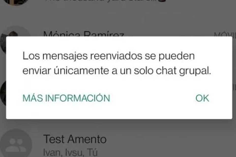 De esta manera fijarán los nuevos límites de envío, permitiendo reenviar un mensaje normal a no más de cinco usuarios o grupos, los reenviados a cinco chats en total, y sólo uno de ellos puede ser grupal, y los mensajes que ya han sido enviados varias veces, únicamente a un chat por vez, sea individual o grupal.