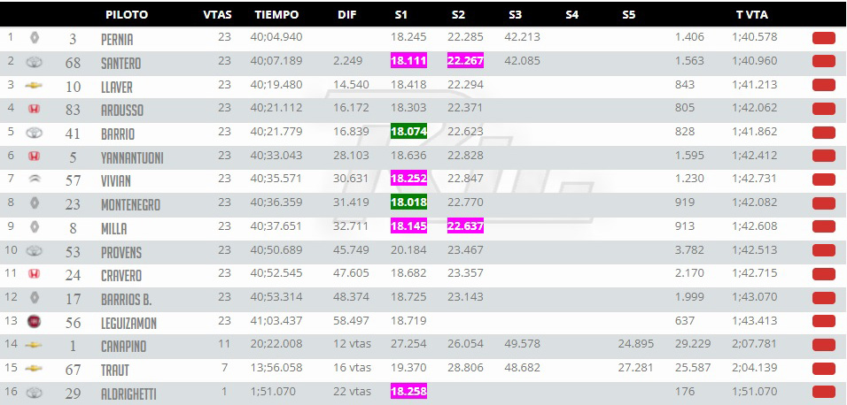 Un gran referente como Facundo Ardusso fue cuarto con el Civic, quinto fue el mejor debutante Jorge Barrio con Totota, sexto Fabian Yananntuoni con Honda, séptimo Franco Vivian con Citroen, octavo Ignacio Montenegro con Renault, noveno Matías Milla con Renault y décimo Eugenio Provens con Toyota.