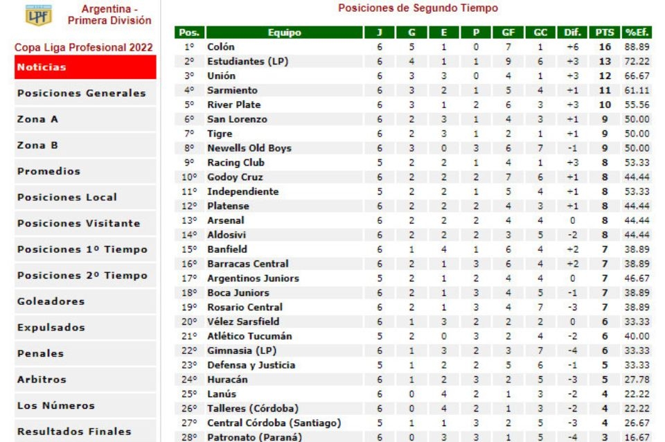 De esta manera, Colón de los seis segundo tiempos ganó en cinco, mientras que empató el restante (ante Tigre), y no perdió niguno de ellos. En ese tramo, el equipo anotó siete tantos y le convirtieron uno, sumando 16 unidades.
