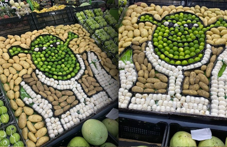 Para lograr el tono de la piel, buscaron limones verdes, y con cabezas de ajo y papas hicieron la ropa. La decoración gustó tanto que un usuario de Twitter lo publicó en su cuenta y se volvió viral en poco tiempo. Todos estaban asombrados de la creatividad de los repositores del súper, que se lucieron con su idea.