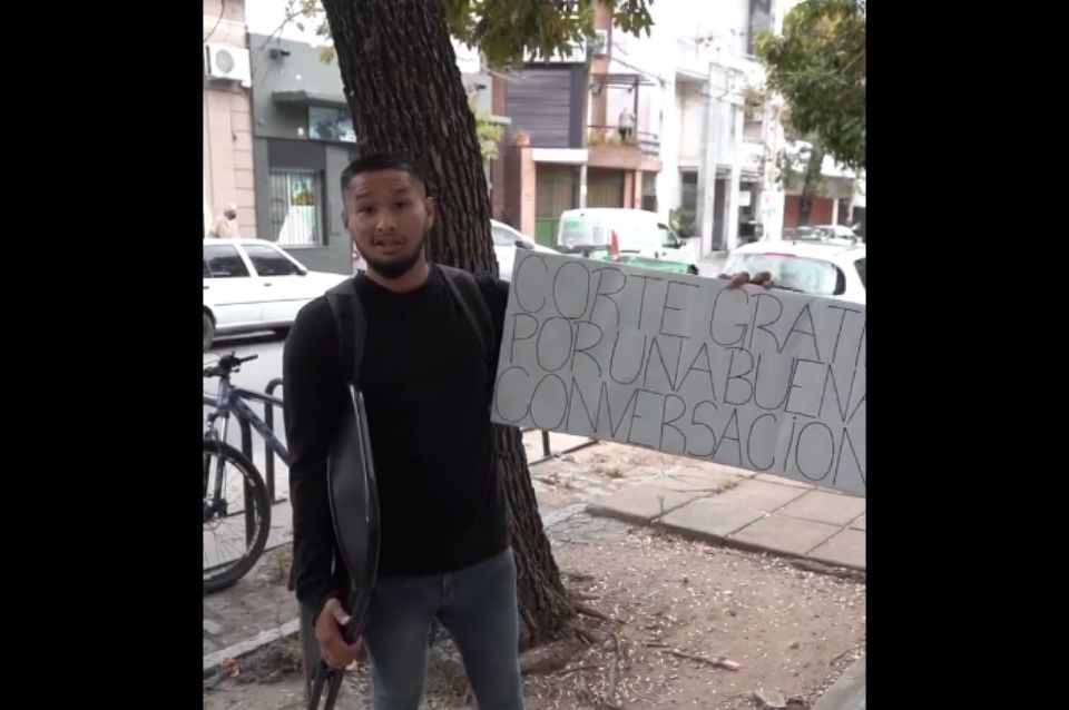 "Hoy salí a caminar por la Ciudad de Santa Fe a ofrecer un corte de pelo a cambio de una buena conversación y conocí a Ramón, me contó un poco de él y su vida" dice el mensaje que compartió en Twitter con un video de su experiencia con Ramón.