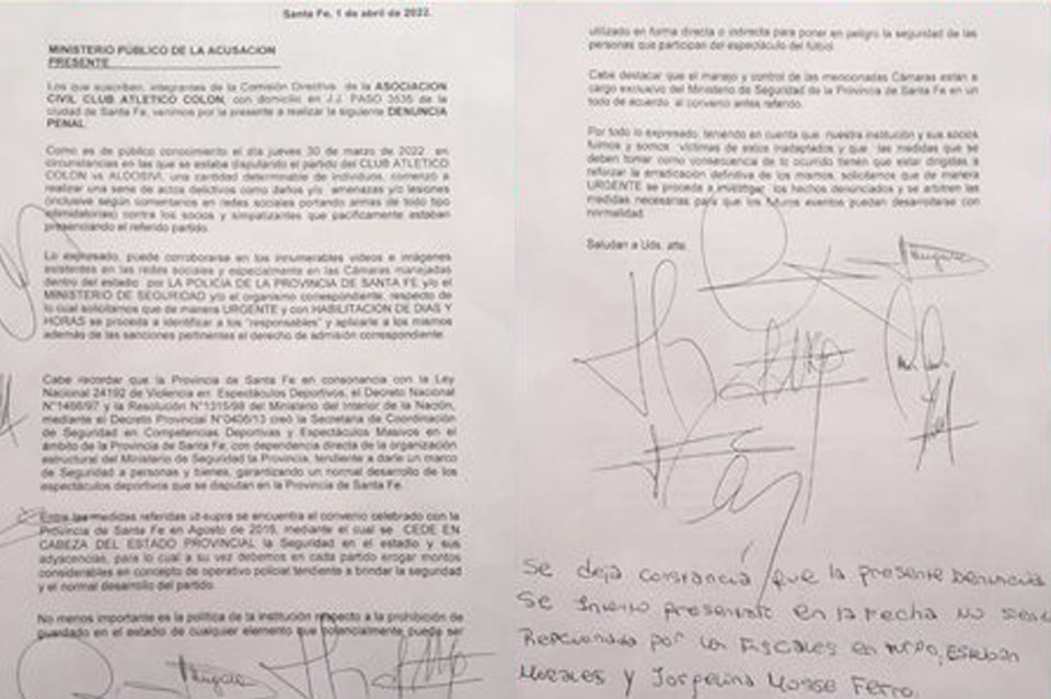 El Ministerio Público de la Acusación lanzó un comunicado este sábado donde explica que en relación a la información que comenzó a circular anoche en las redes sociales acerca de una presunta denuncia del Club Atlético Colón sobre los hechos sucedidos en el estadio Brigadier López el pasado jueves, el MPA, aclara que la institución social y deportiva de la ciudad de Santa Fe no presentó escrito alguno a través de los mecanismos institucionales habilitados para ello.