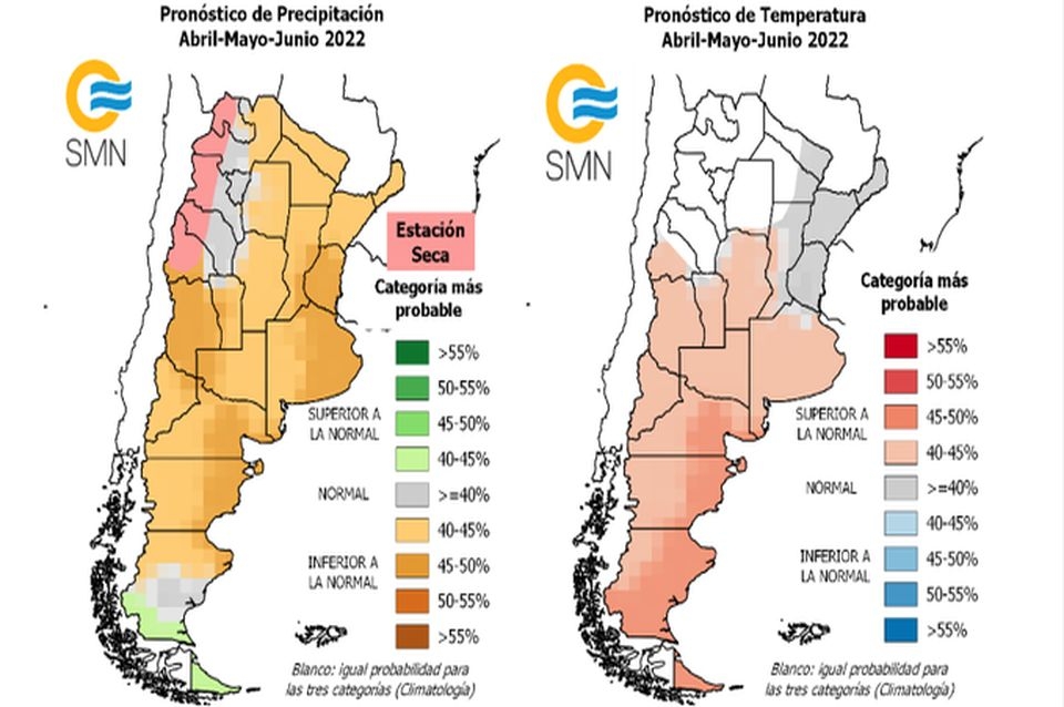 Por otro lado, el organismo dio a conocer su pronóstico para abril, mayo y junio, en el que observó "una mayor probabilidad de que la temperatura sea superior a lo normal" en el este y sur de la Patagonia. Además, sobre gran parte del centro del país y el oeste patagónico, en promedio, las temperaturas "pueden ser normales o superiores a lo normal".