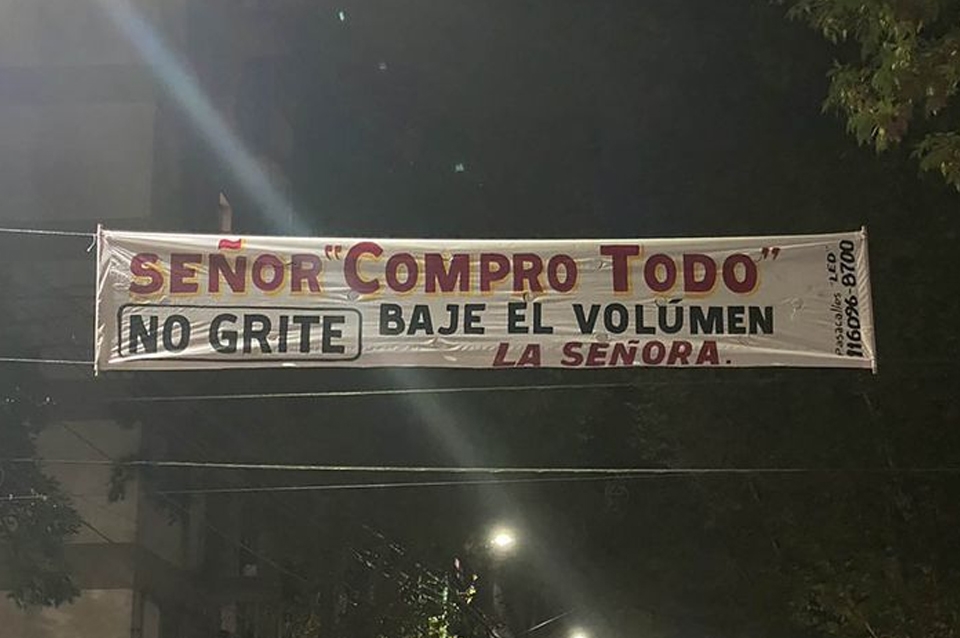 Por ello, la señora colgó un pasacalle dirigido al “señor ‘compro todo’”, al que le pide que “no grite” y “baje el volumen”.