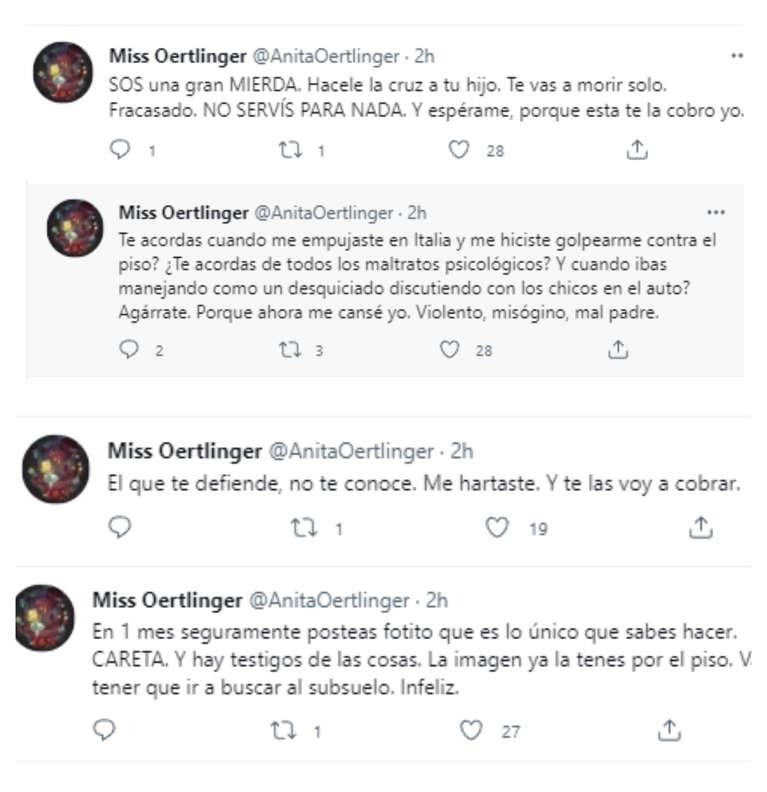 “Sos una gran mierda. Hacele la cruz a tu hijo. Te vas a morir solo. Fracasado. No servís para nada. Y espérame, porque esta te la cobro yo”, advirtió en un primer tuit. Acto seguido la mujer, que en reiteradas ocasiones denunció al exfutbolista por incumplir con la cuota alimentaria de su hijo mayor, relató distintos episodios de violencia y maltrato psicológico.