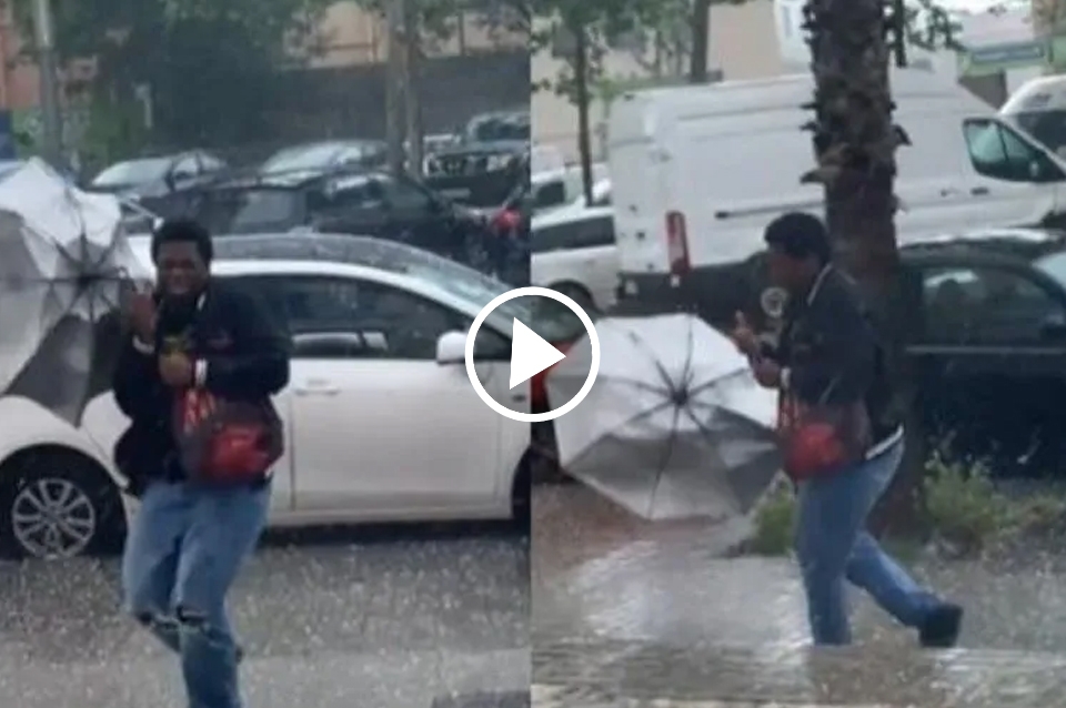 El joven rescata el paraguas, pero otra ráfaga de viento termina por arrastrarla definitivamente. Incluso, el usuario que graba la hilarante escena se ríe a lo lejos con las otras dos chicas porque Fidel casi tropieza.