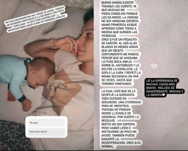 El caso no pasó a mayores porque Noelia enseguida se dio cuenta de lo que estaba pasando y accionó para salvar a su bebé. "Percibí que se ahogaba, lo puse boca abajo sobre el antebrazo y le golpeé la espaldita, le soplé la cara y repetí la misma secuencia un par de veces hasta que terminó vomitando. Lo cual hizo que se le despeje la garganta", explicó. "Repito: no soy experta, pero haber leído e instruirme un poco me ayudó. También puede ganarte la desesperación. Creo que es normal", insistió la rubia, que usualmente se queda sola con su hijo, ya que Arias está radicado en Córdoba por su trabajo como jugador del club Instituto.