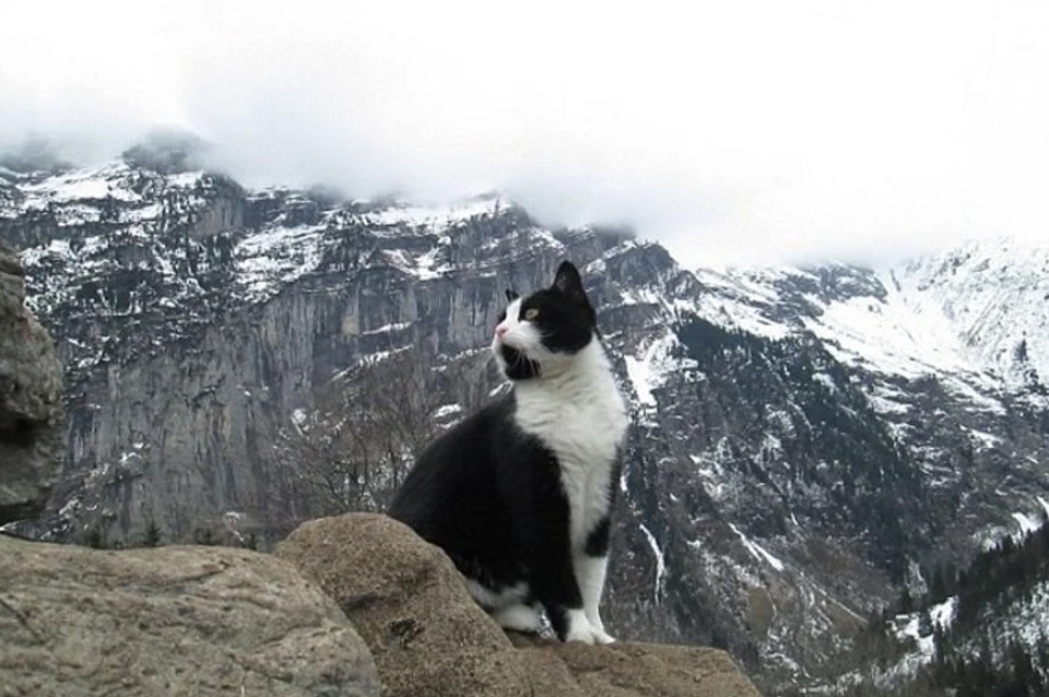 Y así se supo que el moggy era propiedad de una pareja que administraba un albergue cercano y regularmente se unía a los viajeros en sus viajes por la ladera de la montaña.