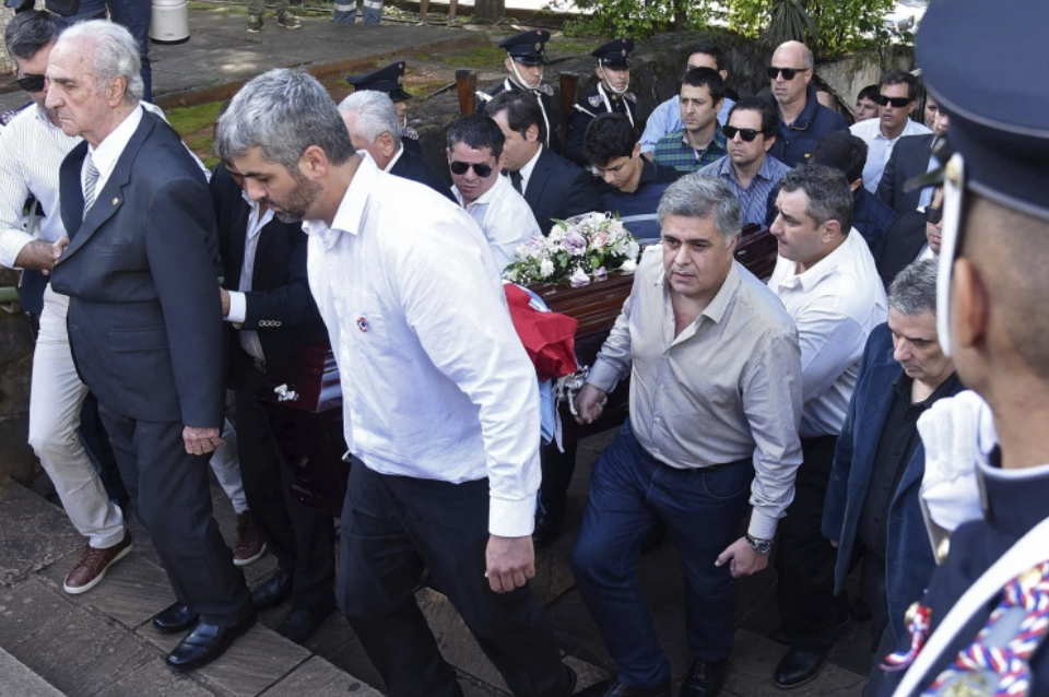 El féretro, que fue velado desde que este sábado llegara procedente de Colombia, fue depositado en el cementerio de La Recoleta envuelto en una bandera paraguaya, otra del club de fútbol Guaraní y otra de la asociación de exalumnos del colegio católico San José.