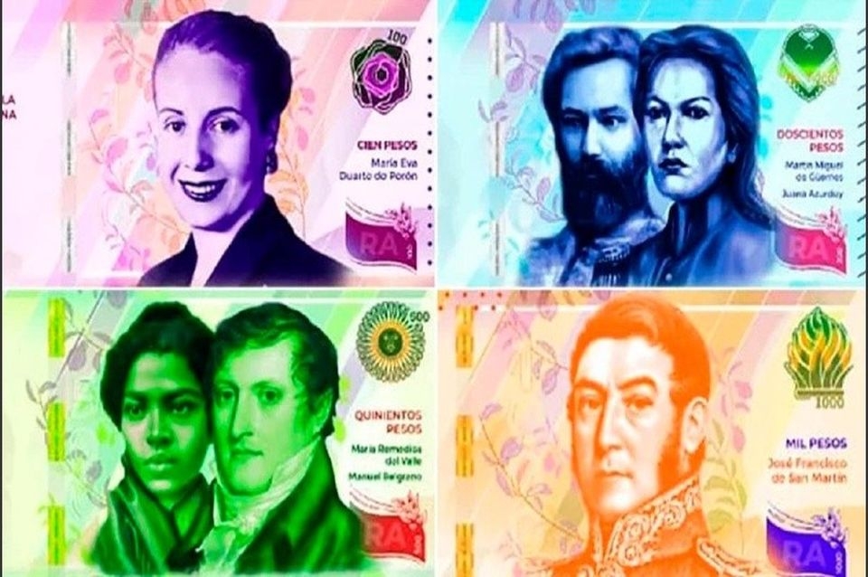 Eva Perón estará en el billete de $100, mientras que el General José de San Martín aparecerá en el de $1000. Otra particularidad de la nueva familia de billetes es que dos denominaciones incluyen la imagen de dos personas distintas: Juana Azurduy y Miguel de Güemes serán las caras del de $200 y Remedios del Valle con Manuel Belgrano del de $500.
