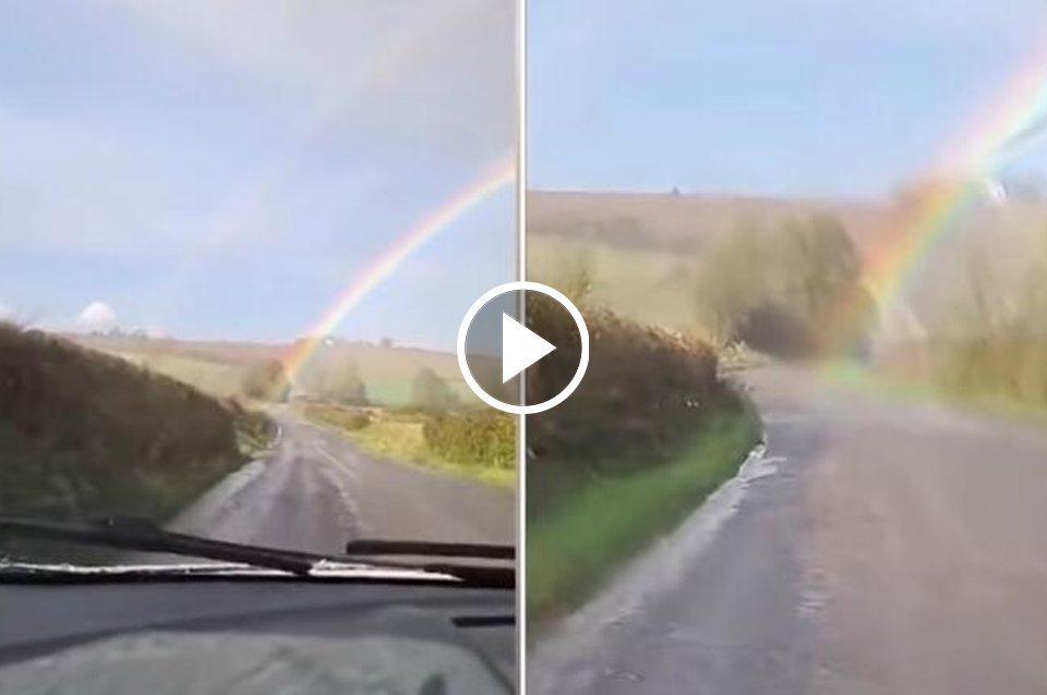 Un increíble video en redes sociales muestra el momento en que una familia inglesa encuentra el final de un arcoíris en medio de una ruta.