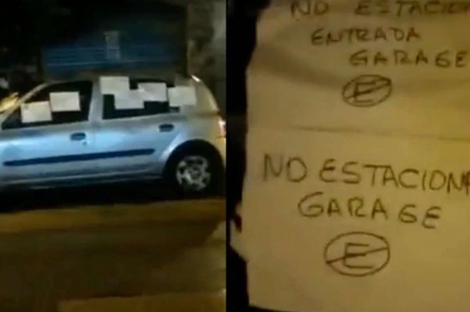 Tapó la entrada de un garaje y su dueño le llenó el auto de carteles