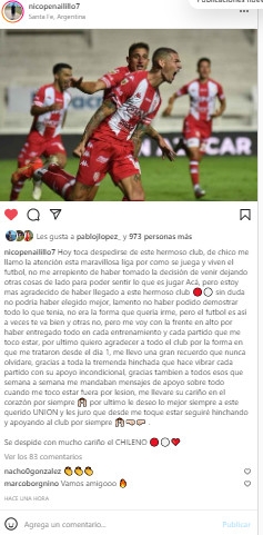 Nicolás Peñailillo se despidió de Unión en Instagram