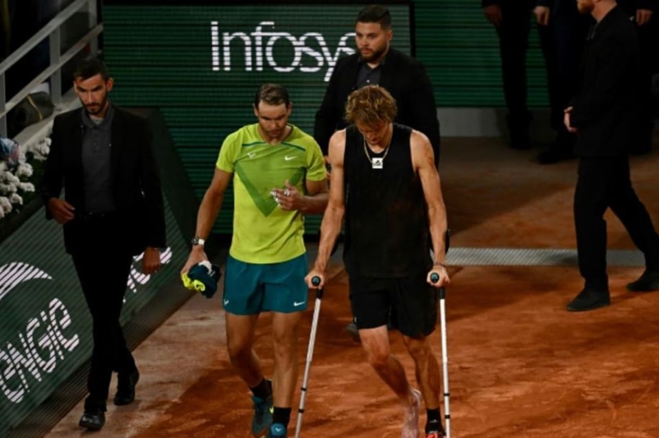 Después de tres horas y 13 minutos de juego y sin terminar el segundo set, Zverev se dobló el tobillo derecho al ir a buscar una pelota, cayó al suelo con gritos de dolor y fue llevado a los vestuarios llorando y en silla de ruedas. Algunos minutos después, el alemán volvió a la cancha central Philippe Chatrier con muletas -y el tobillo muy infamado- para avisar que no podía seguir y saludar a Nadal.