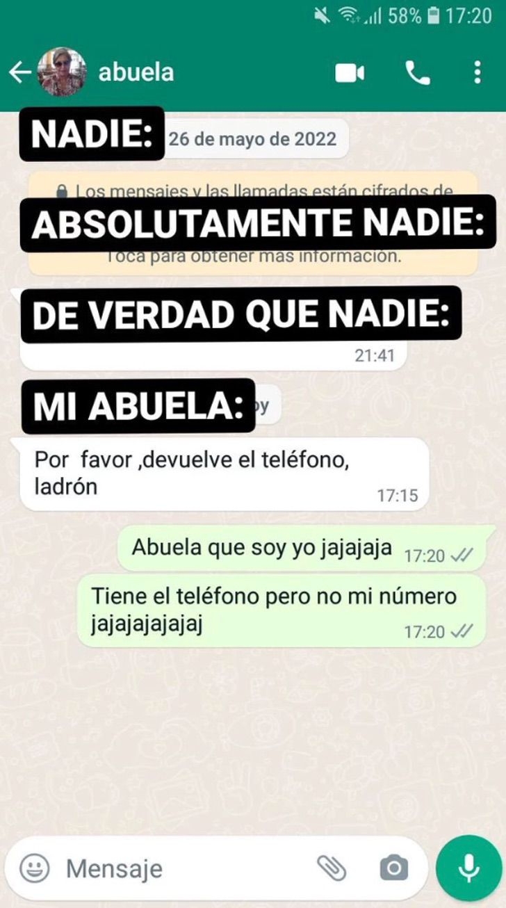 "Absolutamente nadie: Mi abuela:", comentó el joven de Valencia. En aquella conversación se puede ver como claramente la señora se confundió, pensando que al robarle el celular a su nieto, el ladrón iba a quedarse con la cuenta de él.