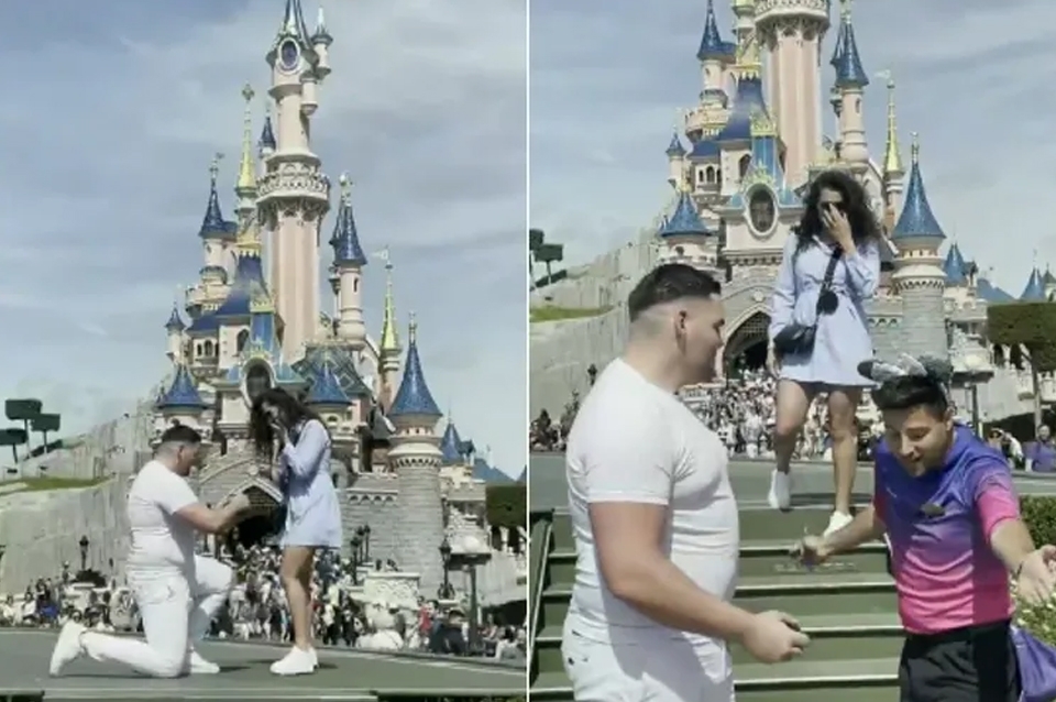 Los testigos, que en un inicio aplaudieron el romántico instante, cambiaron los aplausos por expresiones de asombro y abucheos, mientras la pareja desconcertada salió del área, acompañada por un trabajador con camiseta multicolor y orejas de Mickey Mouse.